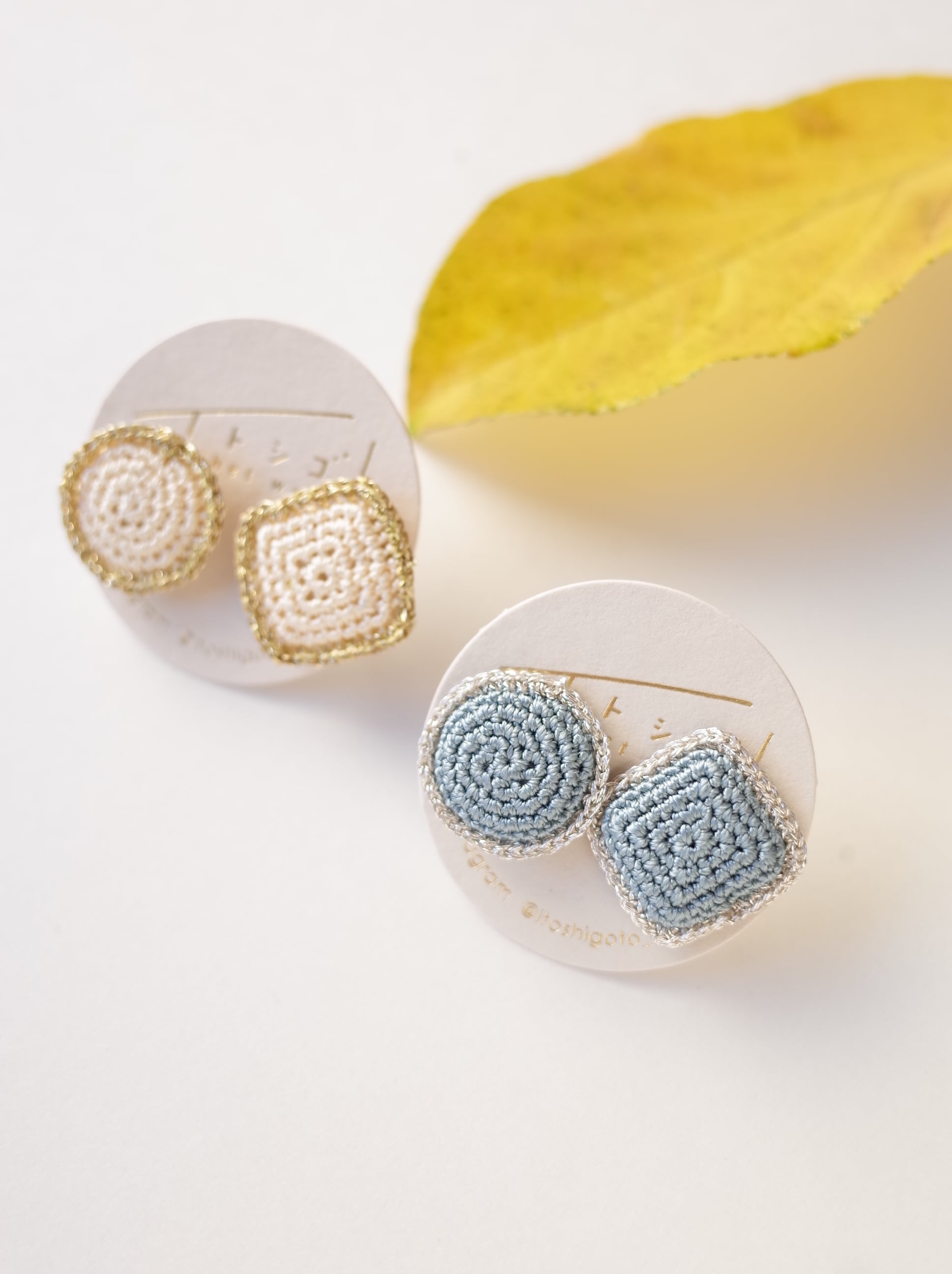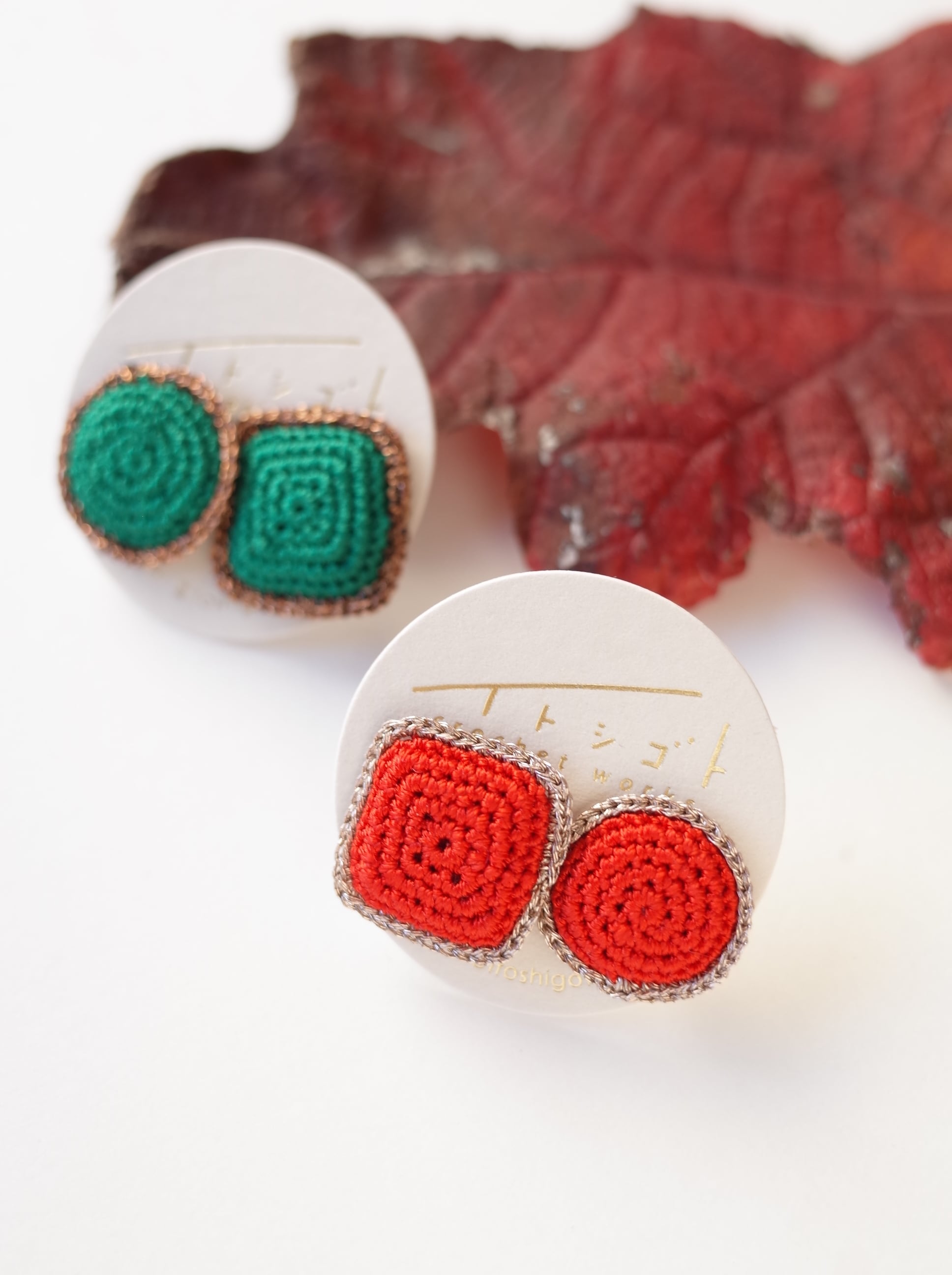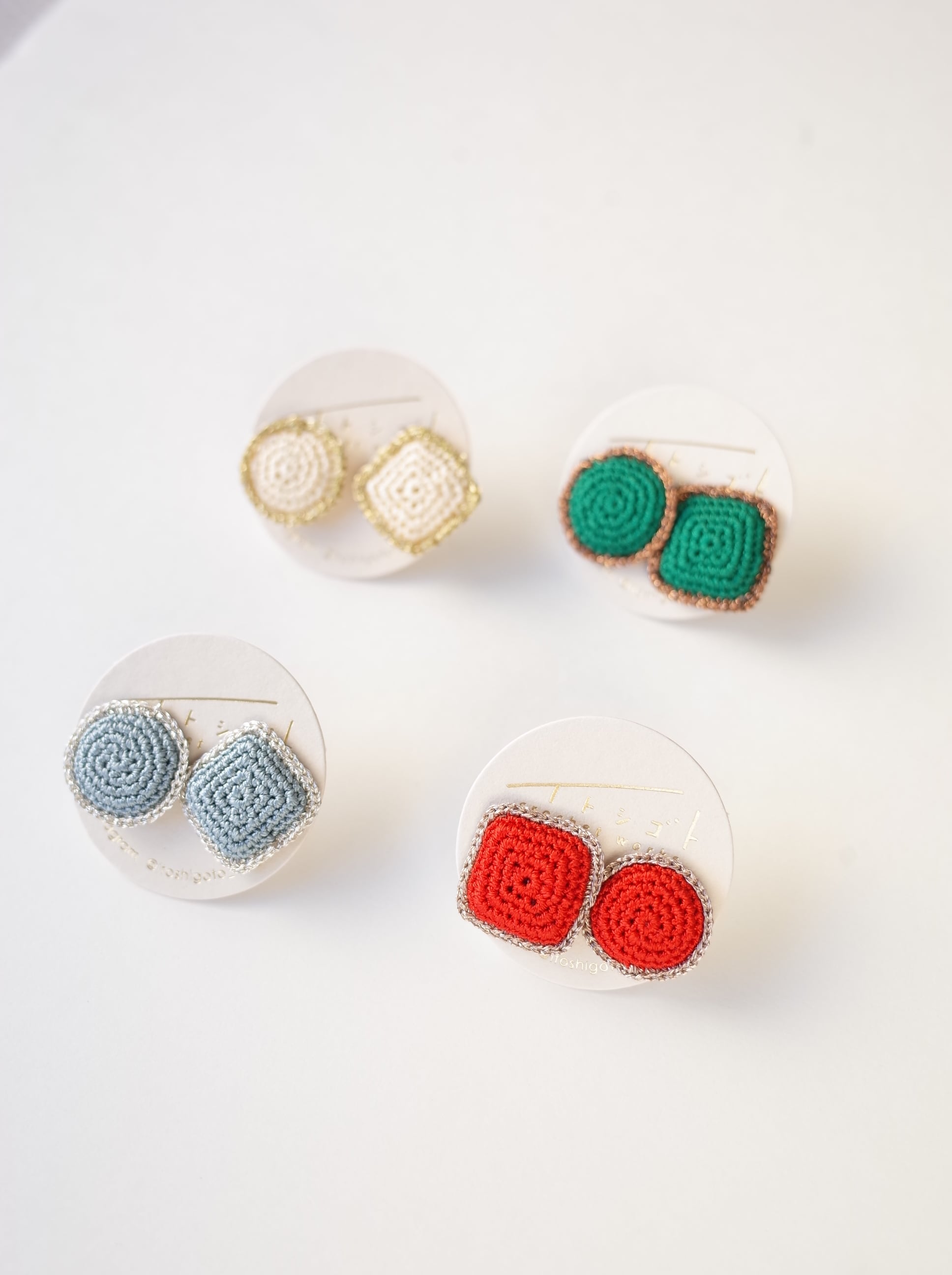 絹糸で編んだ◯と◇が、耳元を明るくポップに飾ります。
