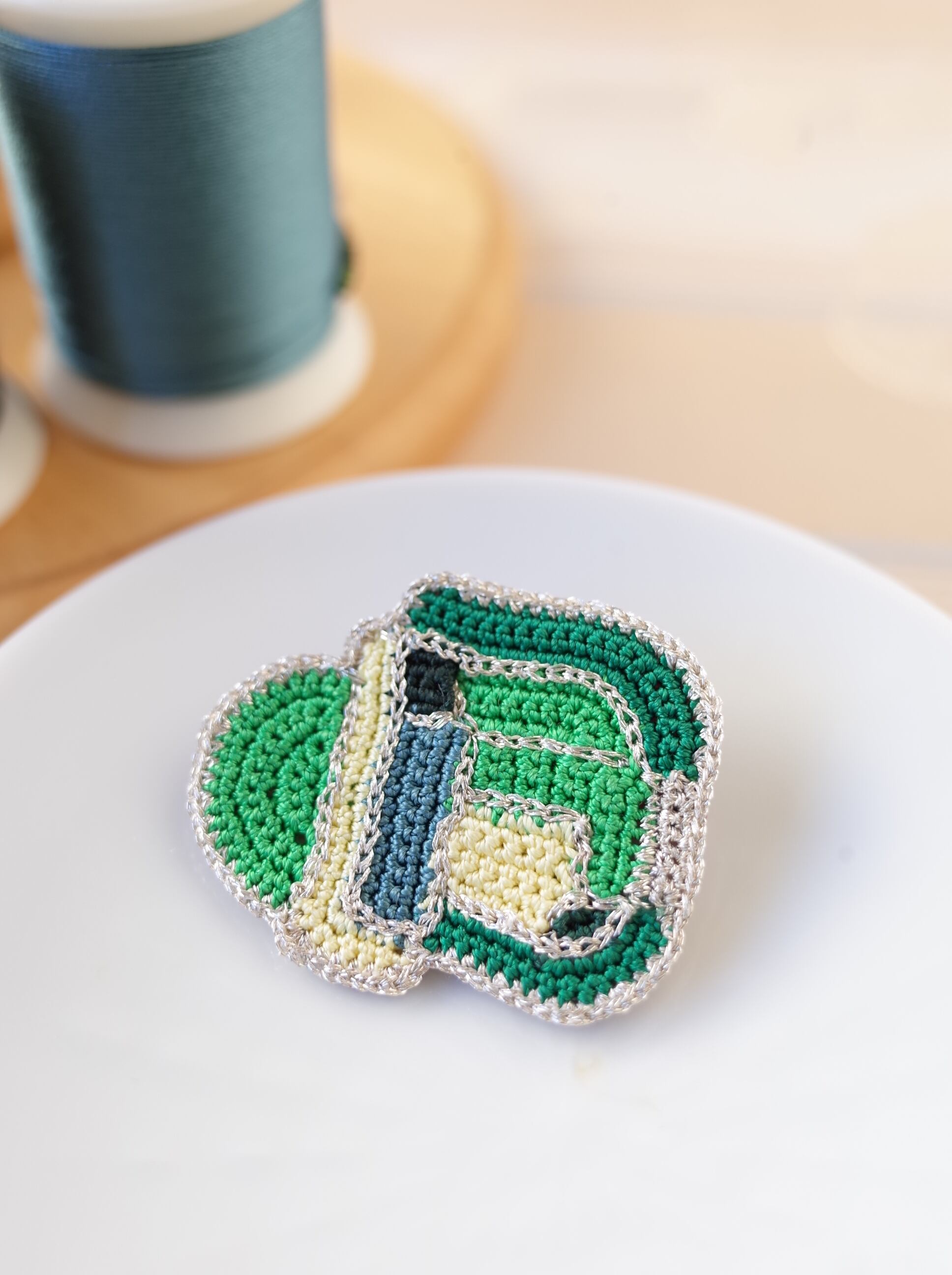 七宝焼きのようなイメージで、色とりどりに編み分けた縁をさらにラメ糸で刺繍しました。