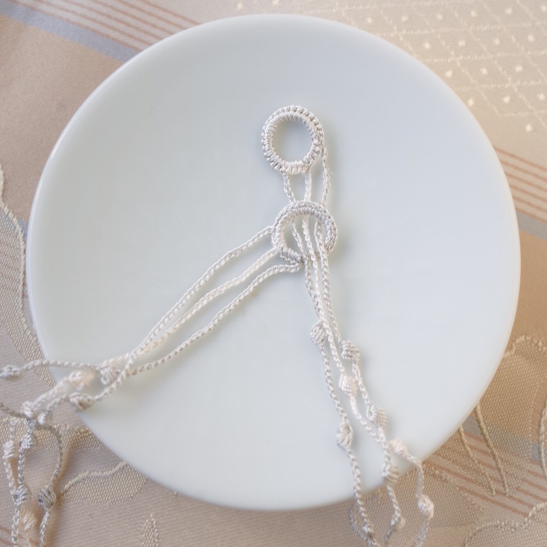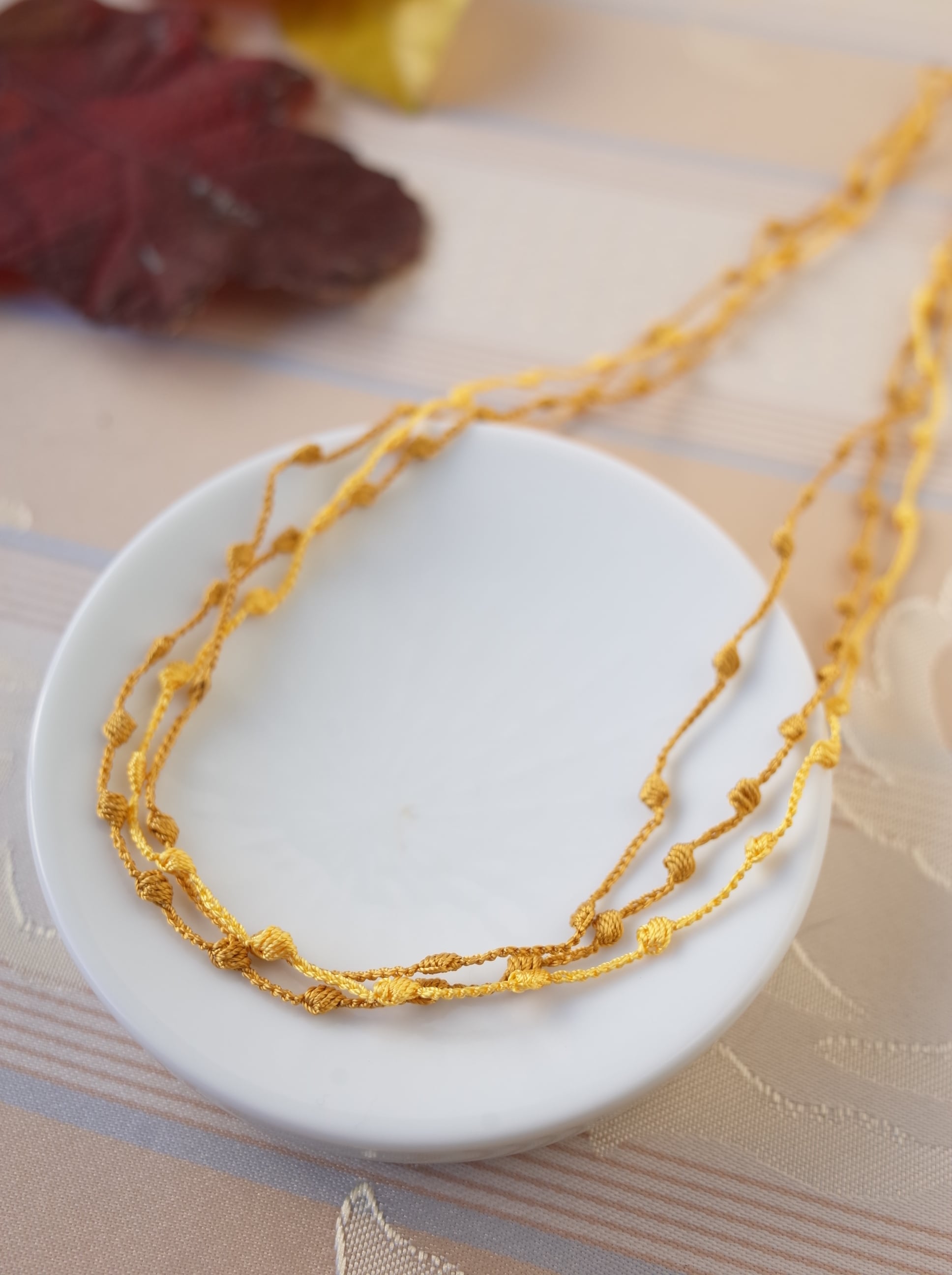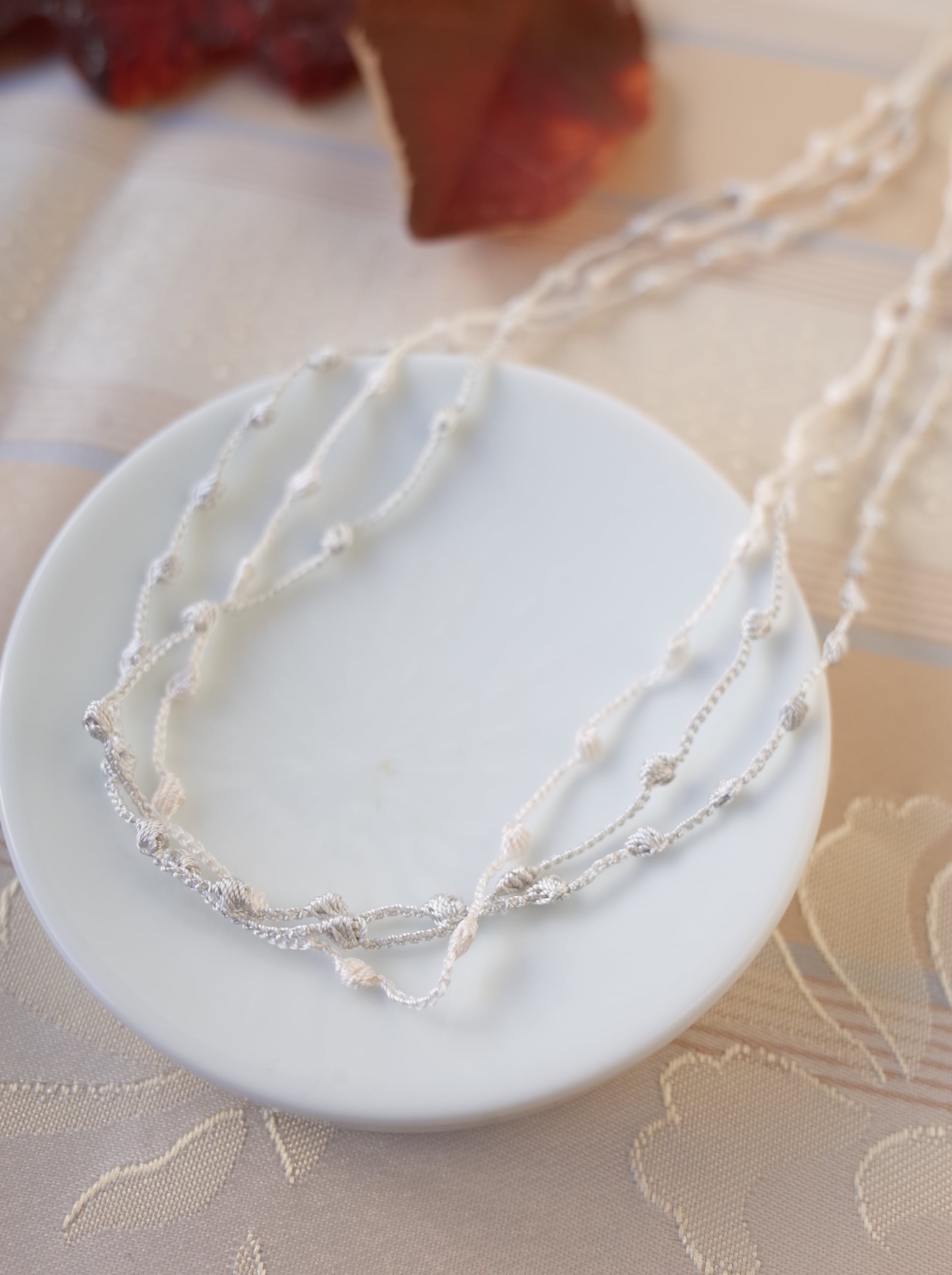 糸で編んだ3本の鎖に散らばる、ちいさな結び目(ノット)が可愛らしいデザイン。