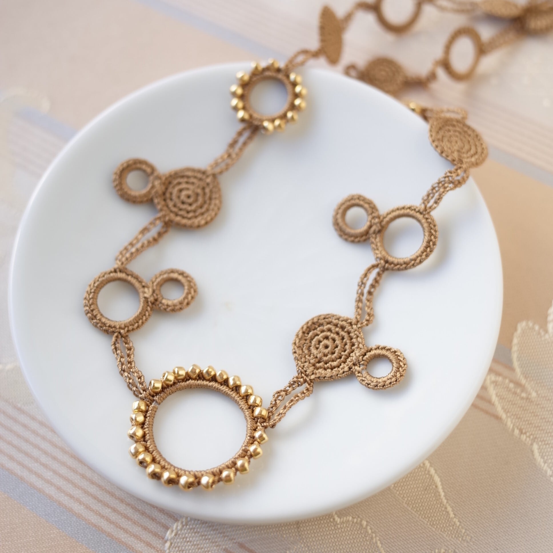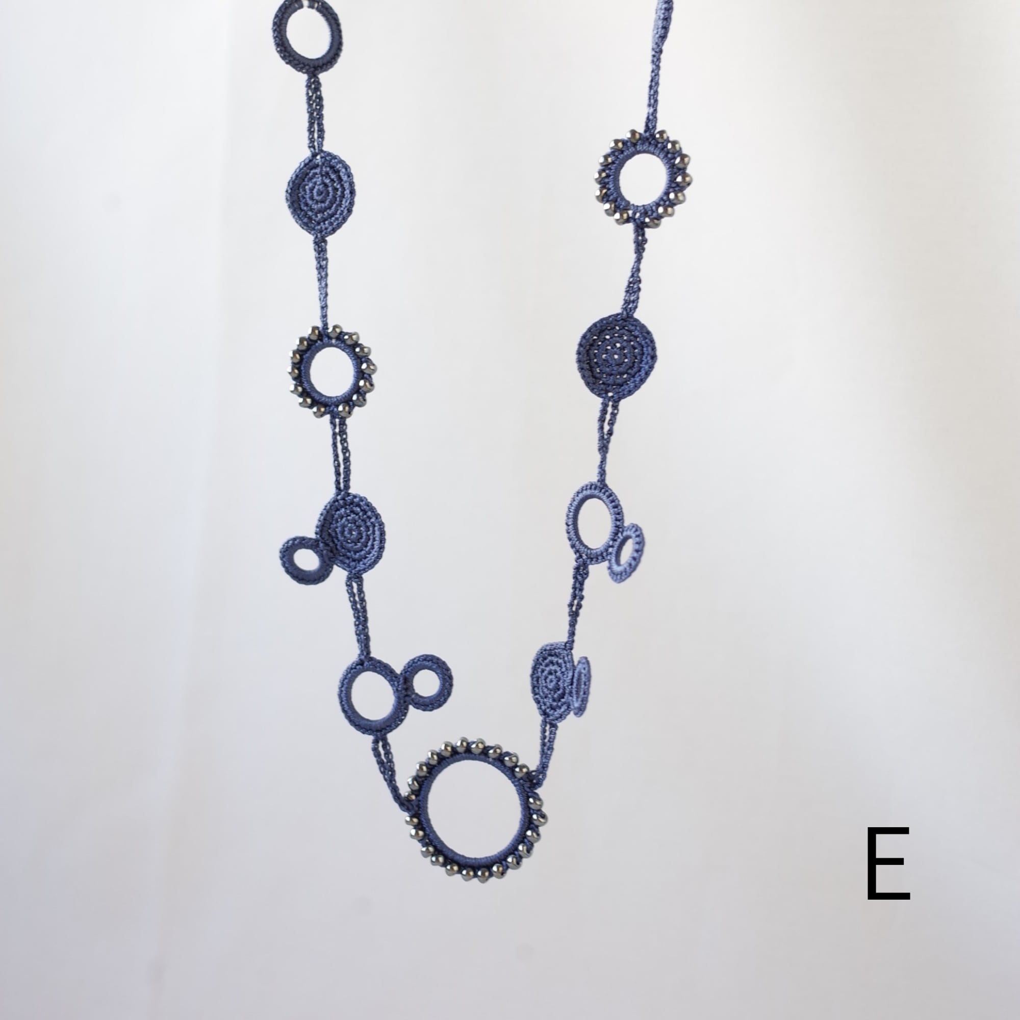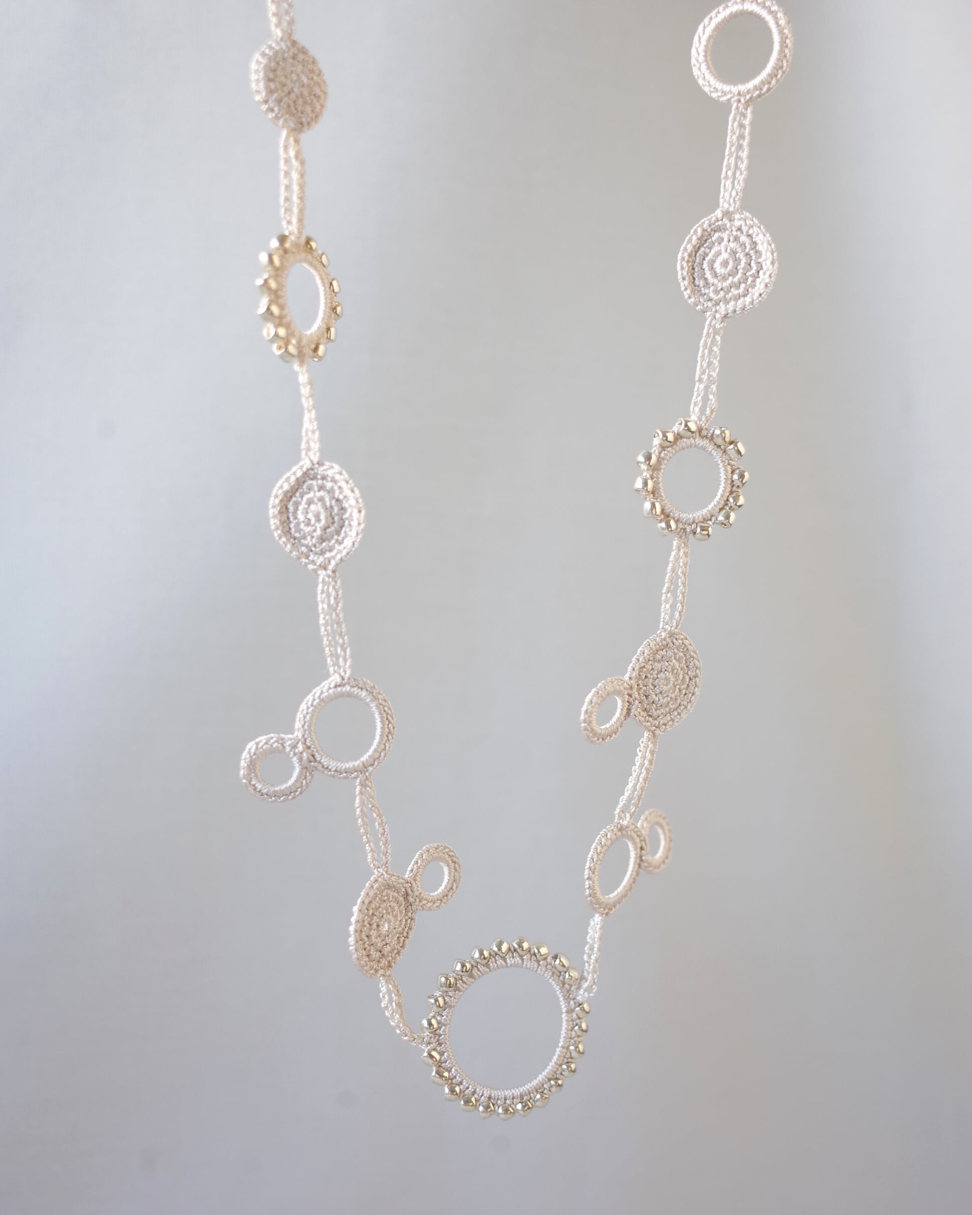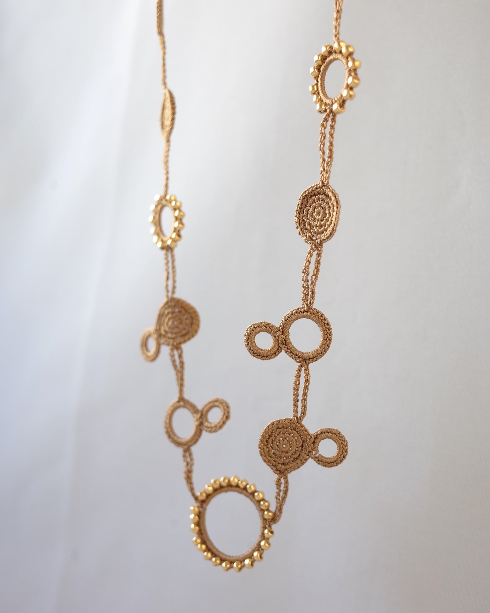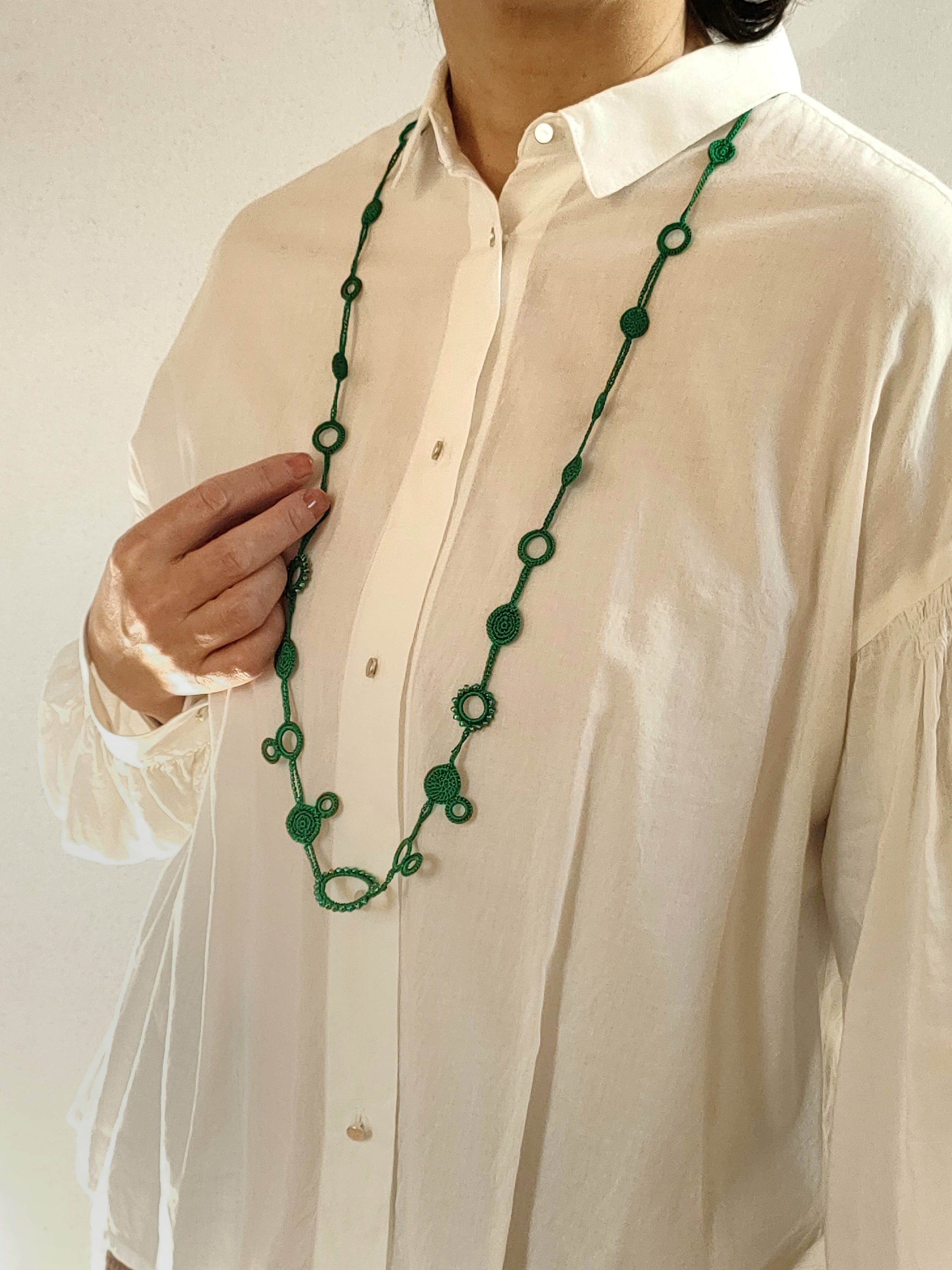 シルクの糸を編んで作った、とても軽いロングネックレスです。