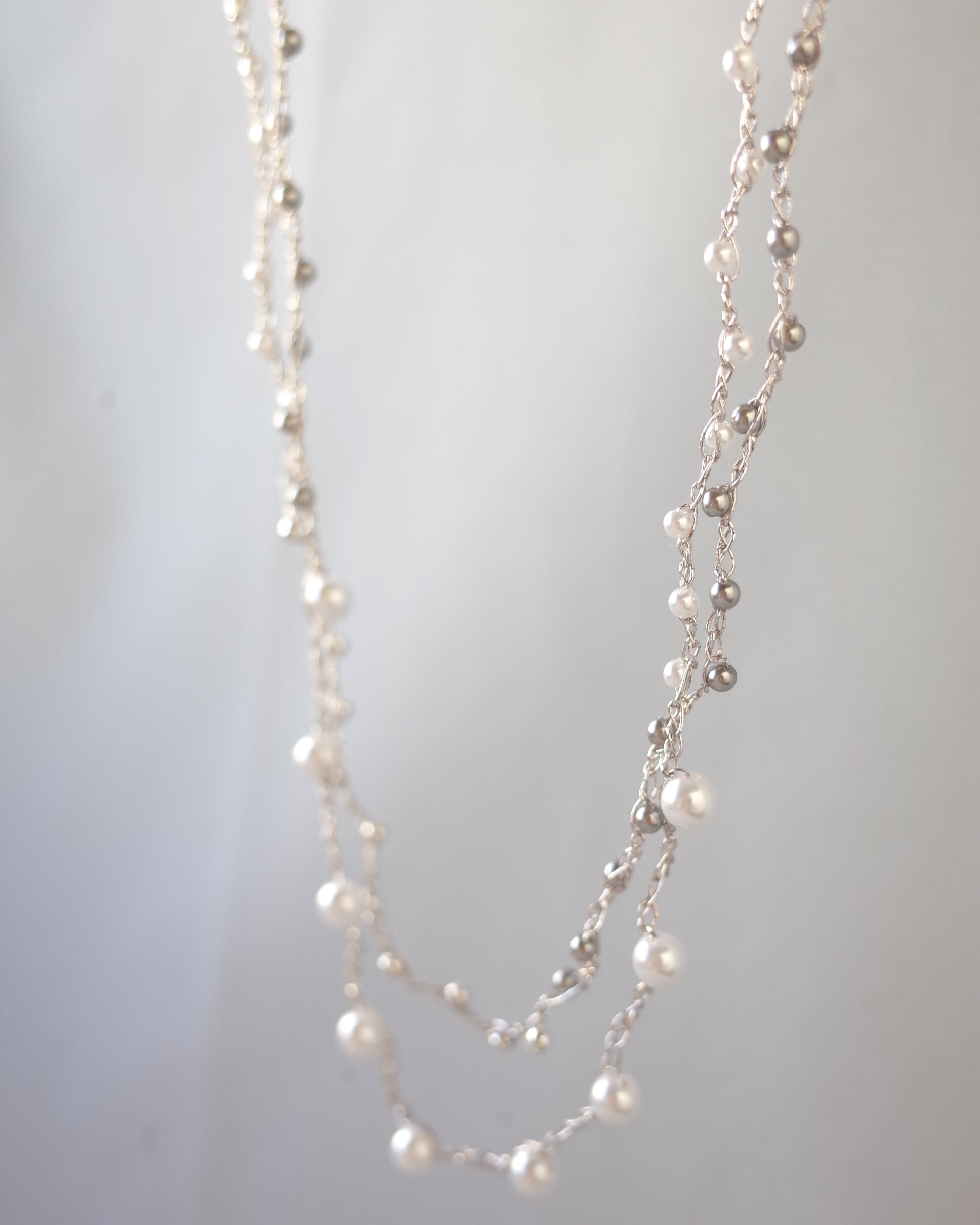 6㎜パールと、3㎜のパール、メタリックビーズ、マットビーズの4種類を編みこみました。